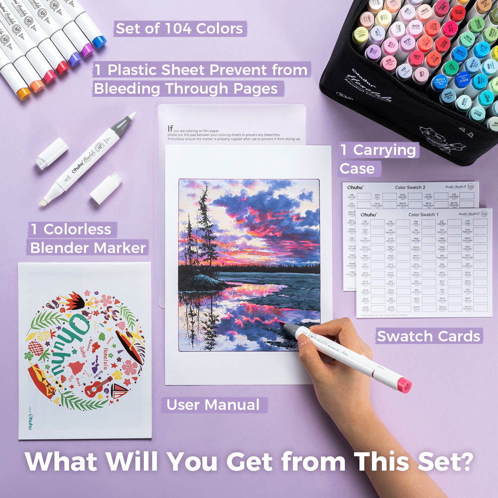Package Includes: Art Marker Set in A Carrying Case with Unique Colors, 1 Colorless Alcohol Marker Blender, Color Swatch Cards, 1 User Manual & 1 Plastic Sheet for Prevent Ink from Bleeding through.