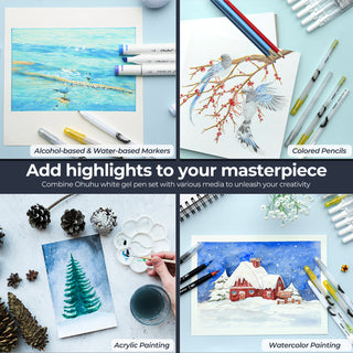 This Ohuhu Gel Pens Set is designed to make art and craft projects a breeze. Its perfect ink flow allows you to glide effortlessly across paper without skipping or clogging, while the highly opaque ink stands out vividly on both dark and colored papers. Use these pens for precise touch ups, highlights and reflections.