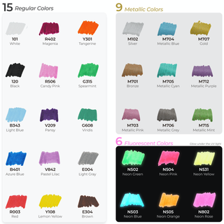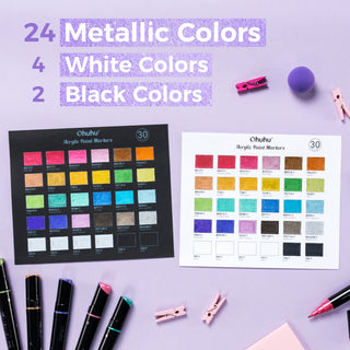 Each set includes 15 base colors, 9 metallic colors and 6 fluorescent colors for your unlimited and imaginative creation. 9 special metallic colors for shining and embellishment can be used to draw flowers or people, such as eye shadows and makeup. Whether you're an illustrator, craft addict, or a DIY enthusiast, the Ohuhu 30-color acrylic markers has got you covered!