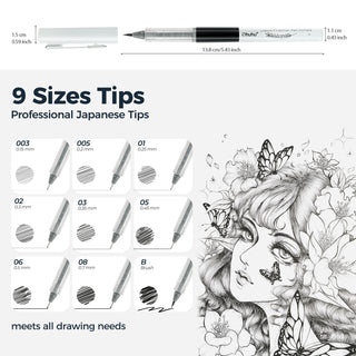 Ohuhu Liquid Fineliner Pens feature 9 assorted tips, including 0.15mm, 0,2mm, 0.25mm, 0.3mm, 0.35mm, 0.45mm, 0.5mm, 0.7mm and a brush tip.