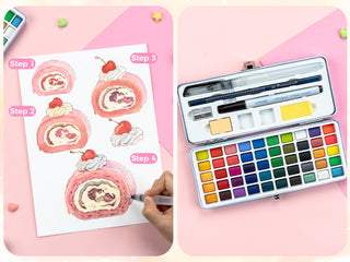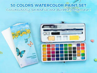 Everything you need in one portable, durable metal box, including 50 vibrant watercolors, 10 sheets of watercolor paper, a water brush pen, an acrylic fineliner pen, a pencil, an eraser, a sponge, a pencil sharpener, a swatch card, and 2 empty grids for color grading. Perfect for Outdoors, Travel. Paint on-the-go!